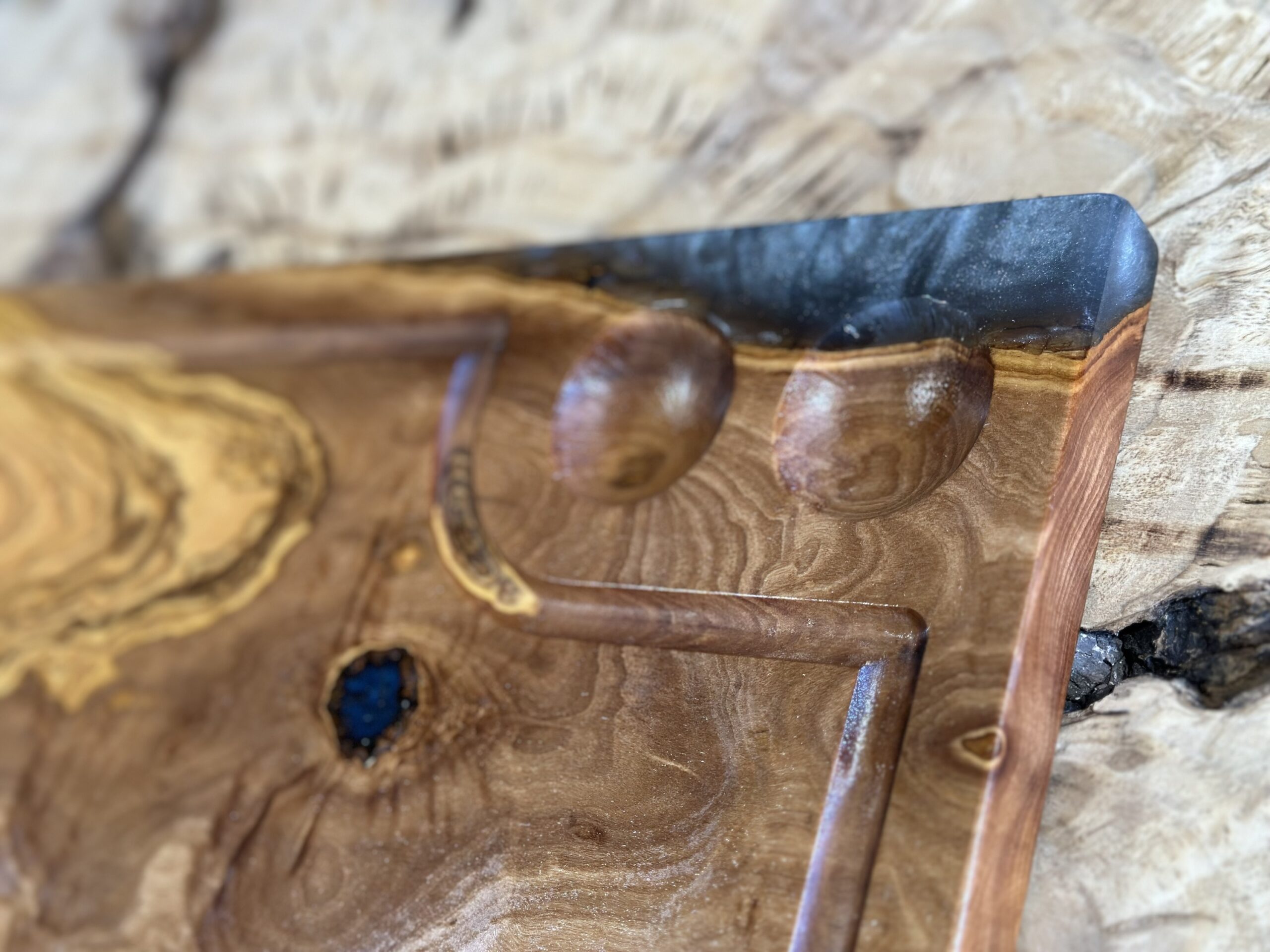 בוצ'ר מעץ זית בשילוב אפוקסי עם חריטה ומקום למלח פלפל