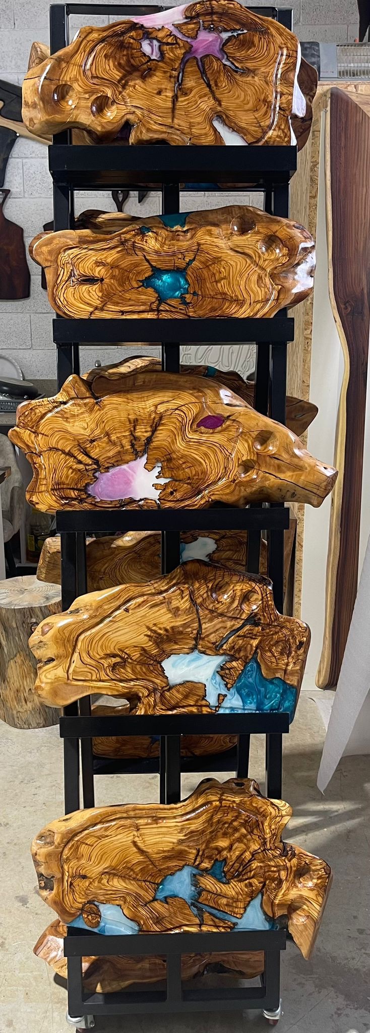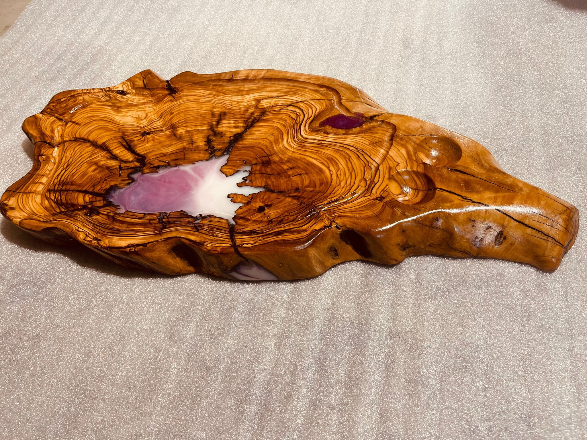 בוצ'ר מעץ זית בשילוב אפוקסי עם חריטה ומקום למלח פלפל