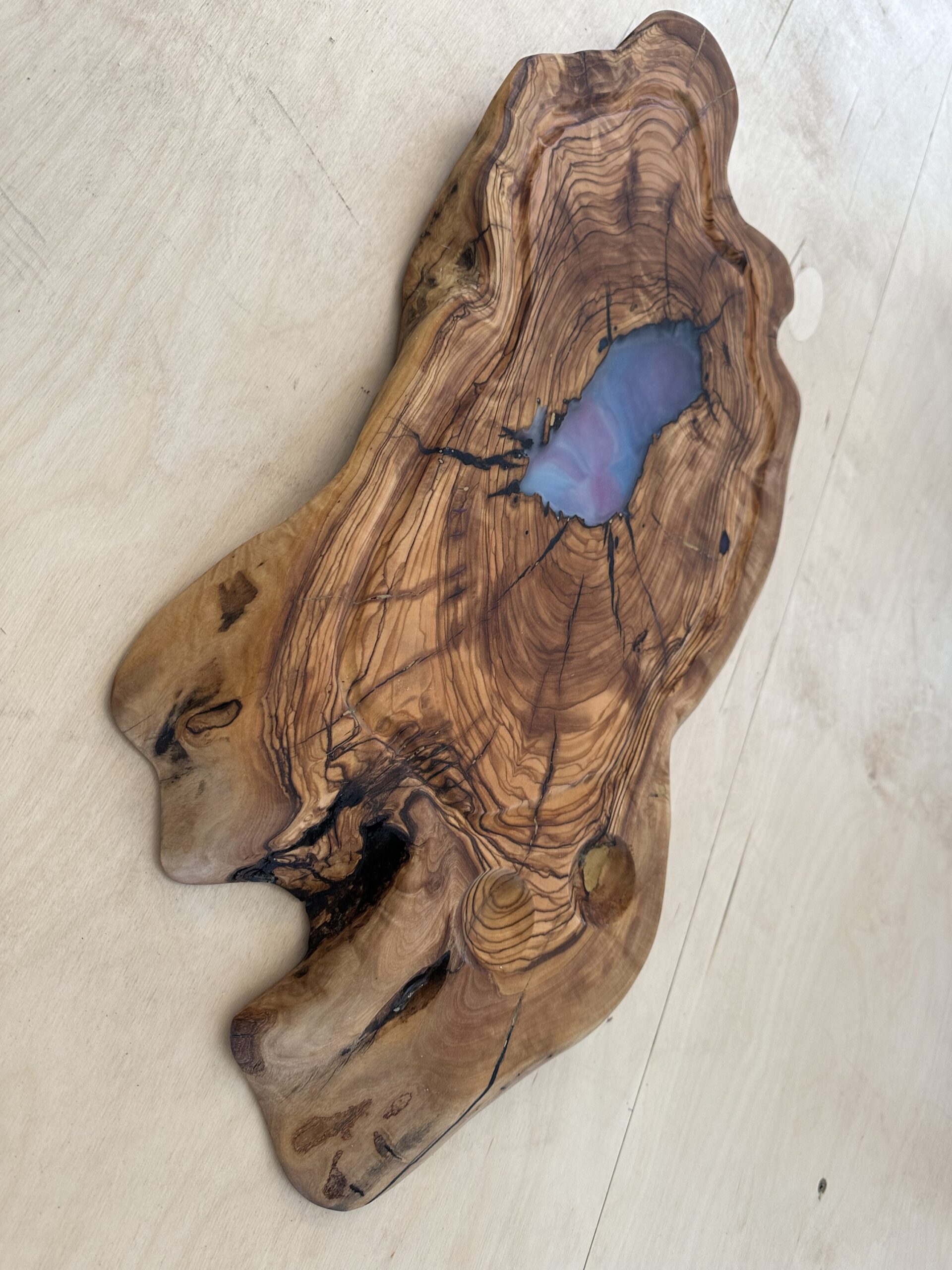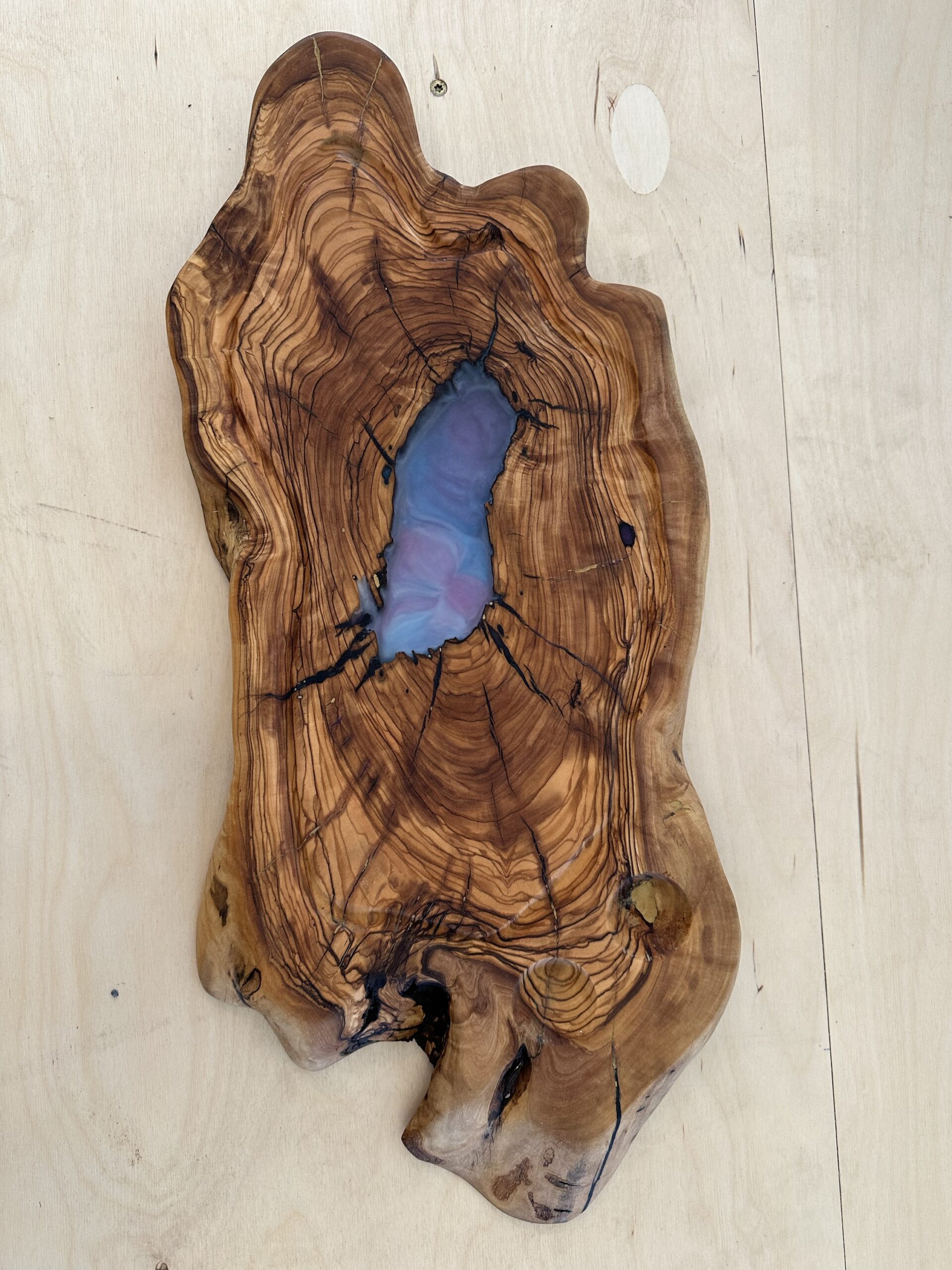 בוצ'ר מעץ זית בשילוב אפוקסי עם חריטה ומקום למלח פלפל
