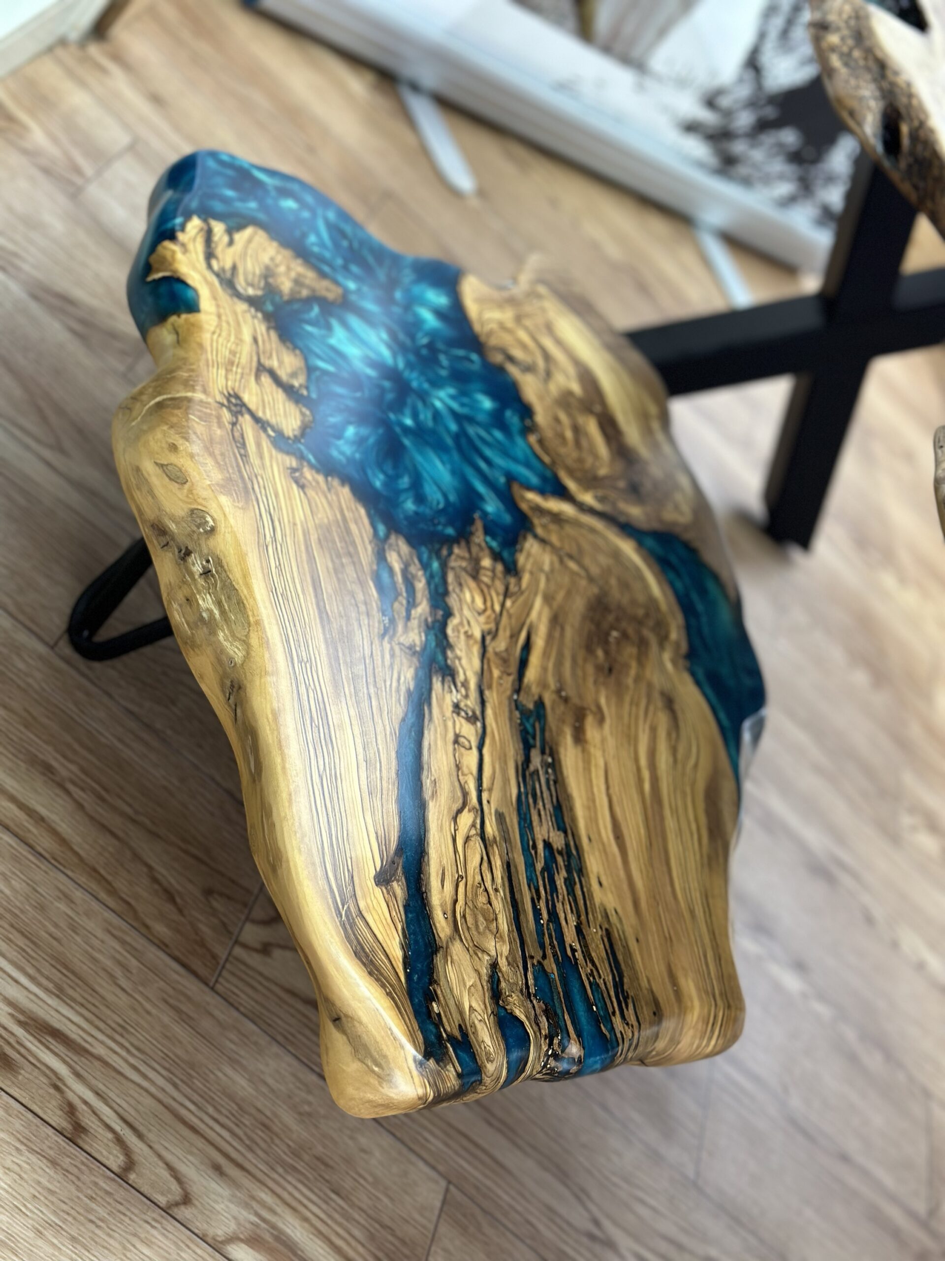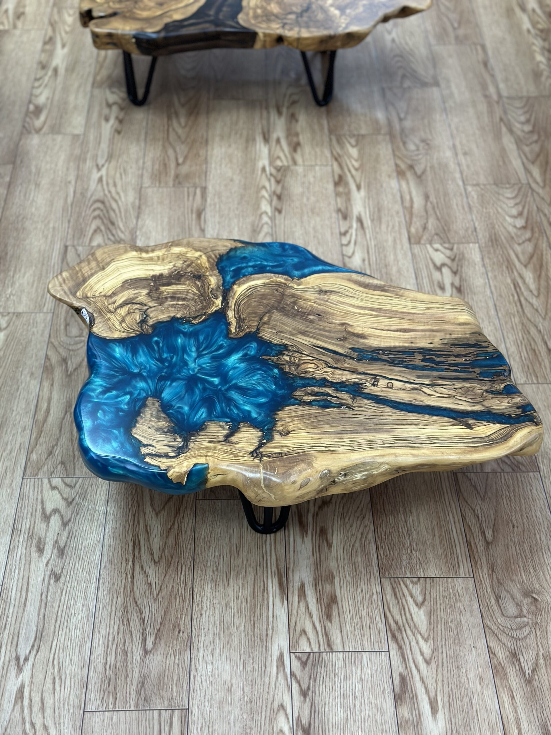 שולחן לחדר מזרחי מעץ זית בשילוב אפוקסי צבע כחול
