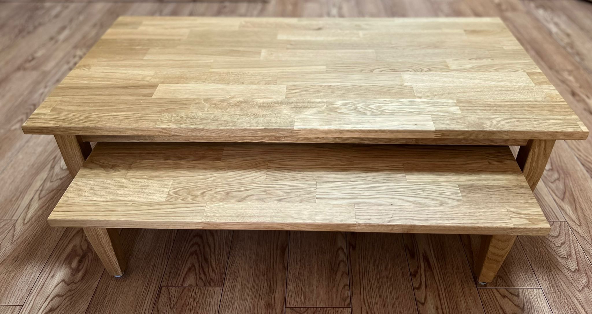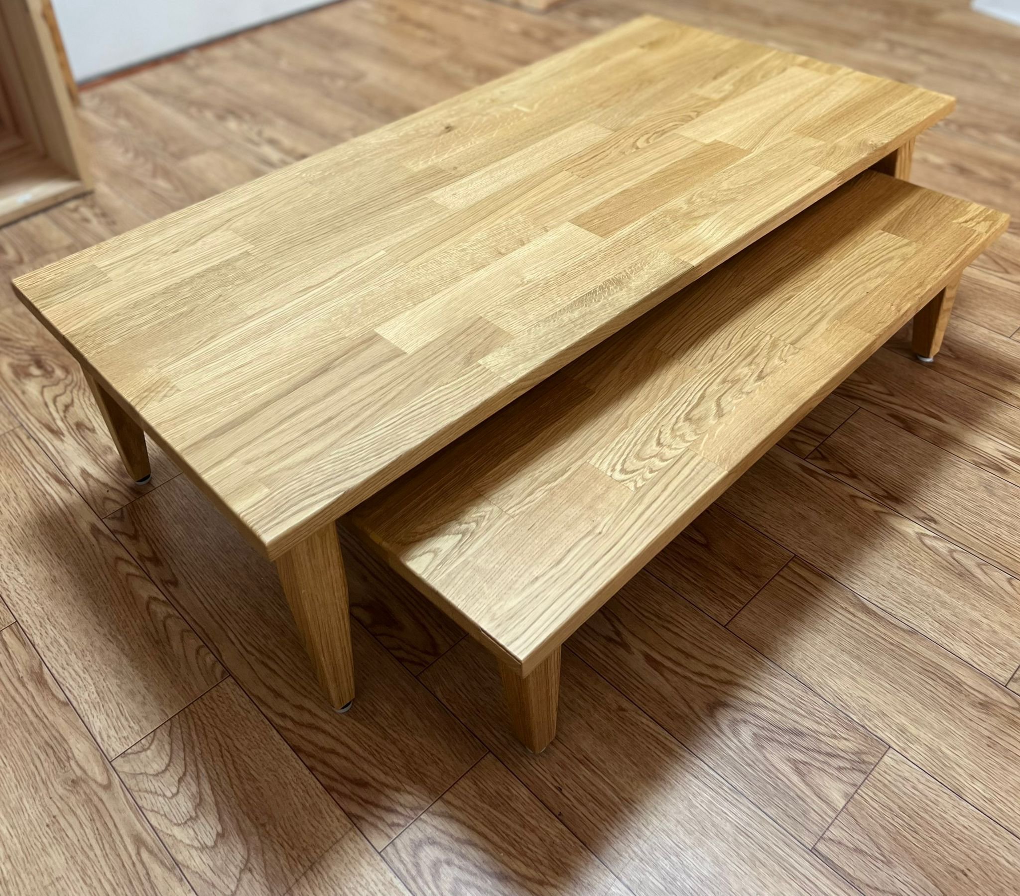 סט שולחנות לחדר מזרחי עץ מלא אלון מבוקע עדין רוחב 50 ס"מ/אורך 100 ס"מ/גובה 28 ס"מ רוחב 44 ס"מ/אורך 80 ס"מ/גובה 20 ס"מ