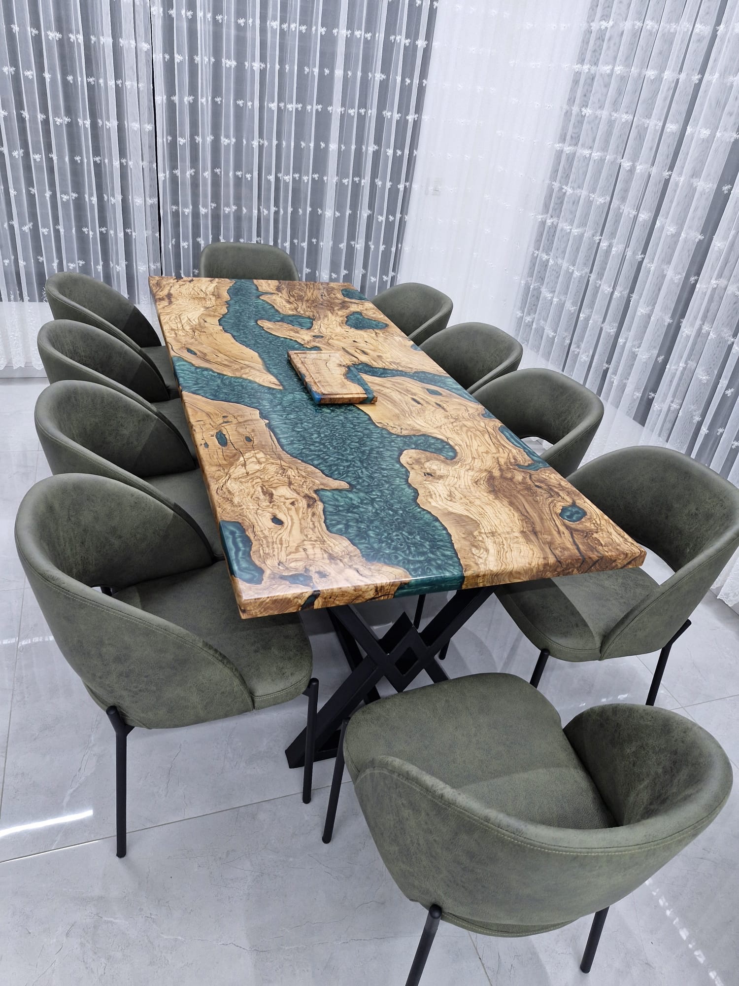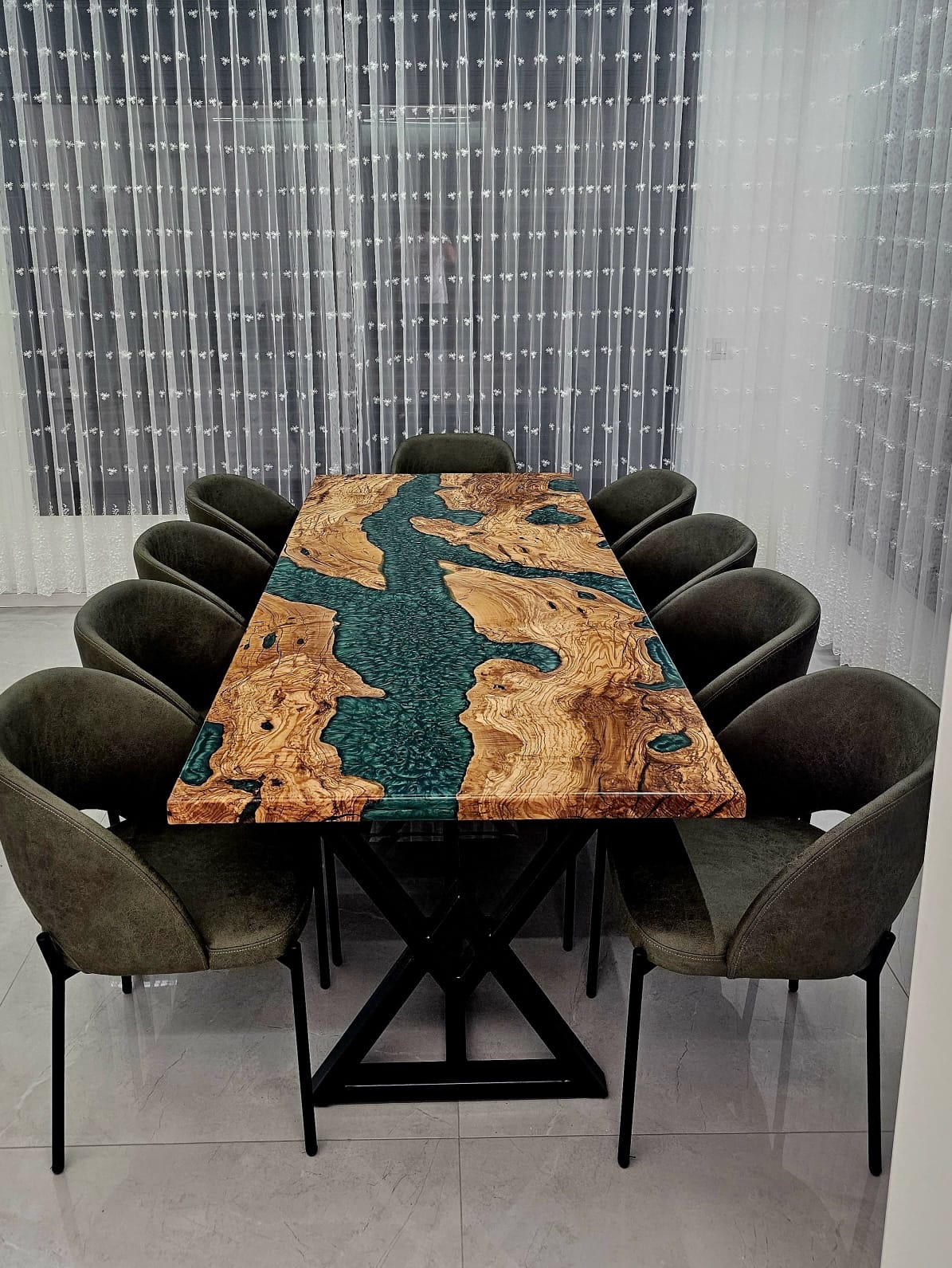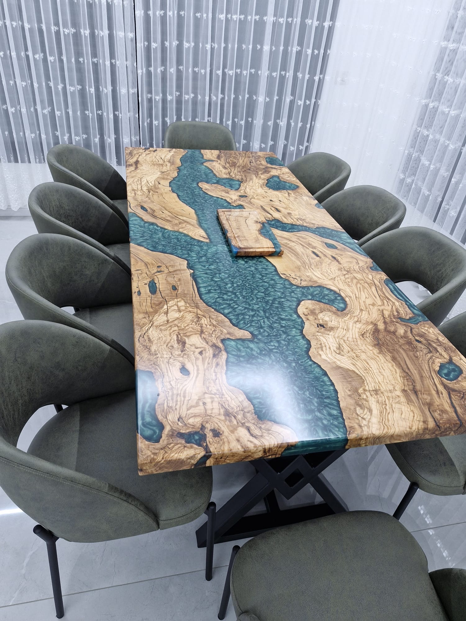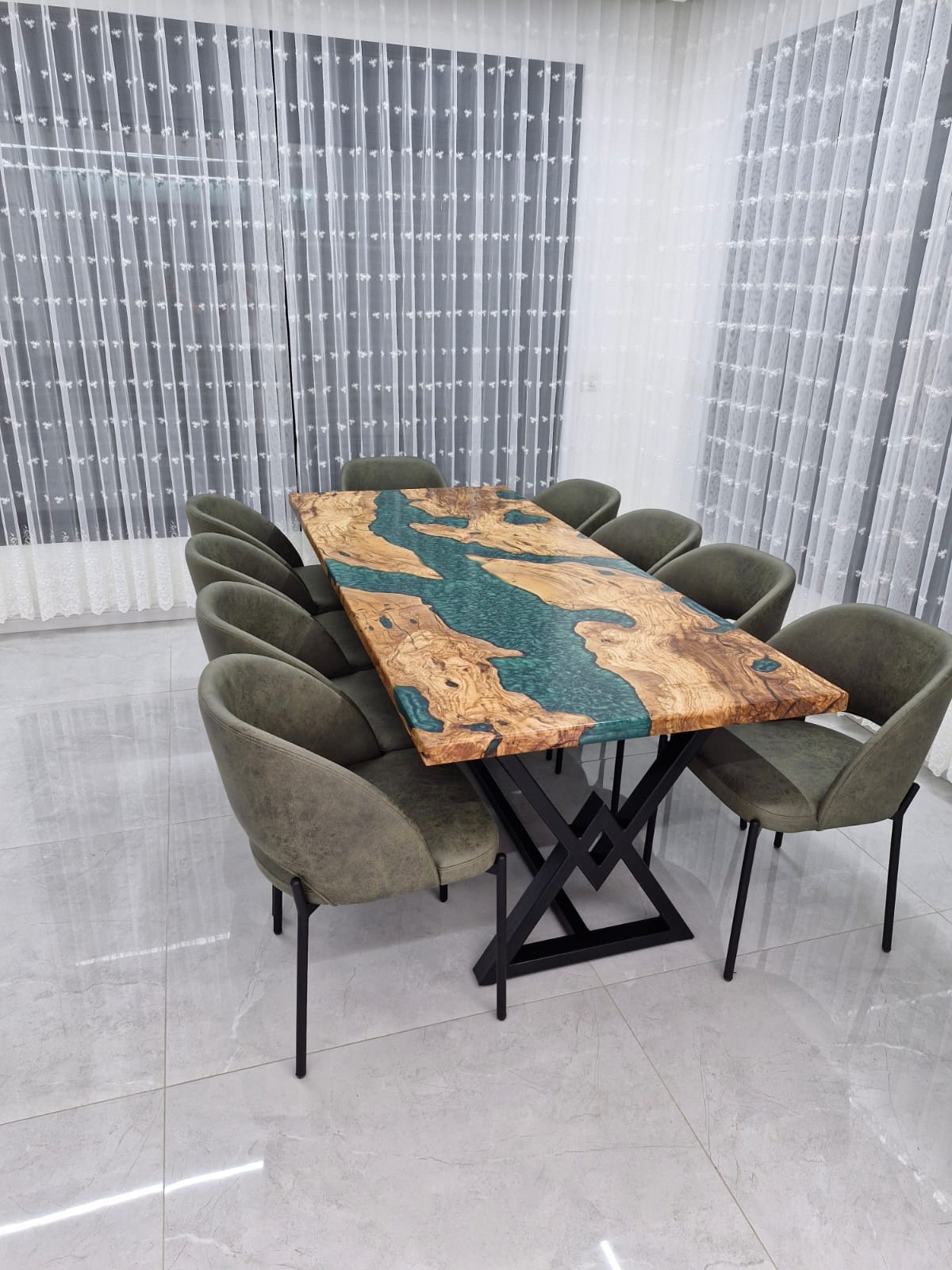 שולחן אוכל מעץ זית בשילוב אפוקסי צבע כחול