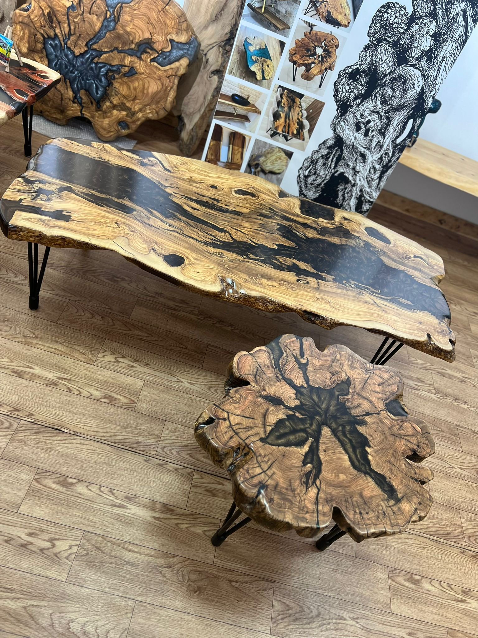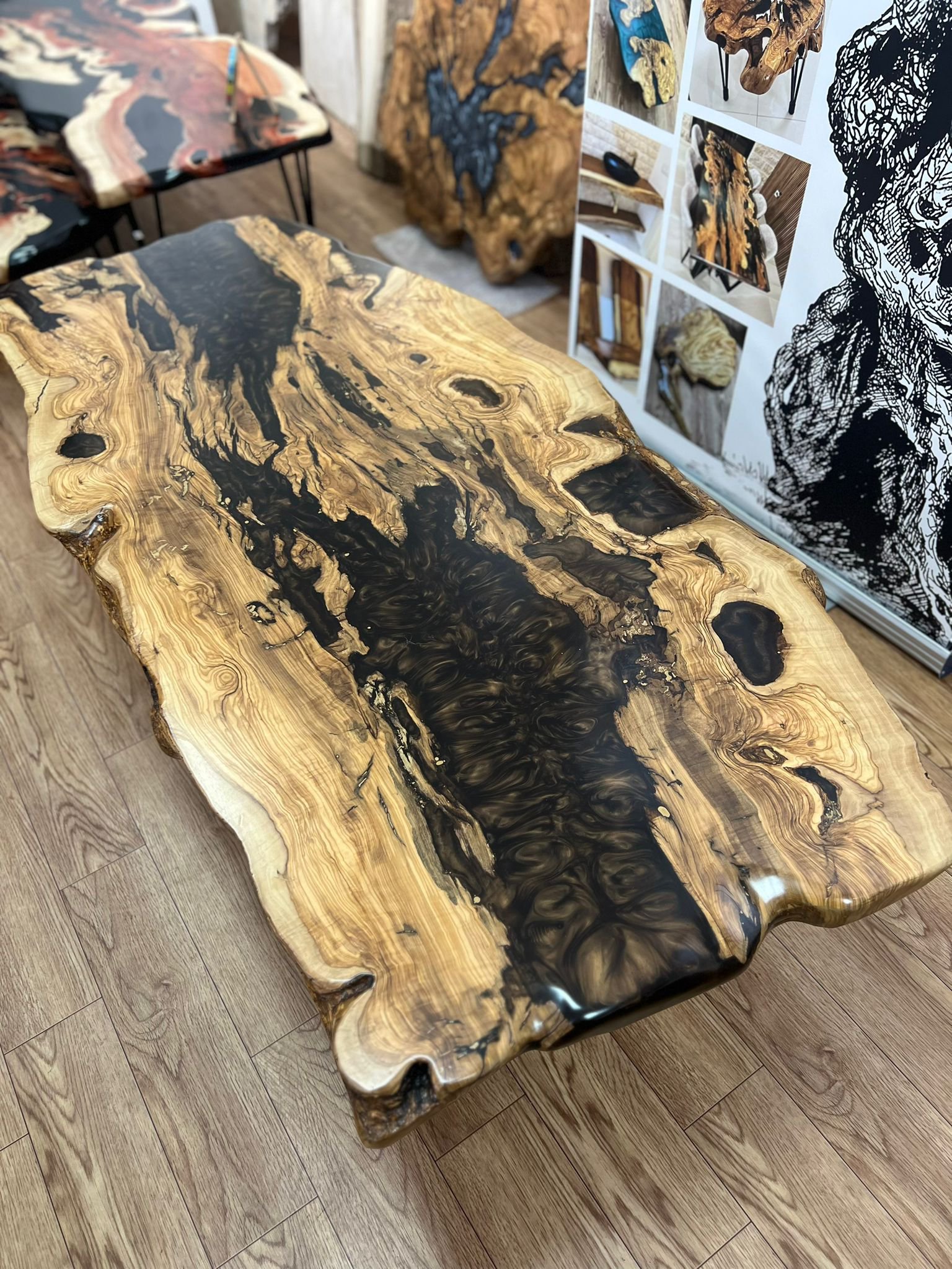 שולחן סלון ו שולחן קפה מעץ זית עם שילוב אפוקסי צבע חום