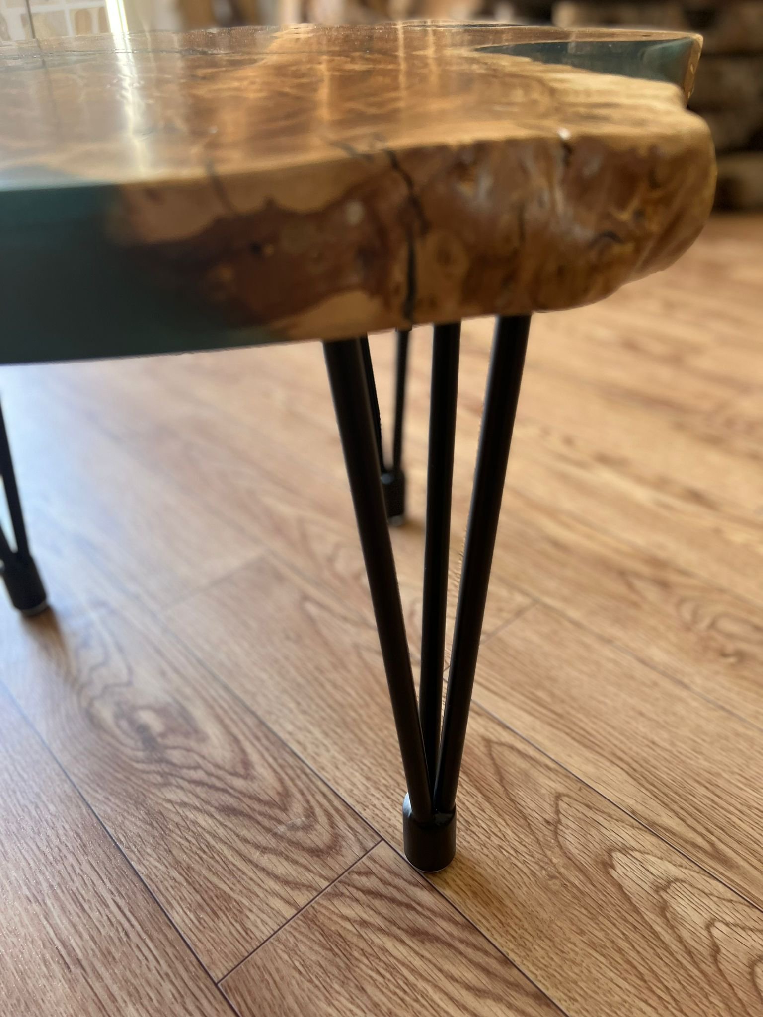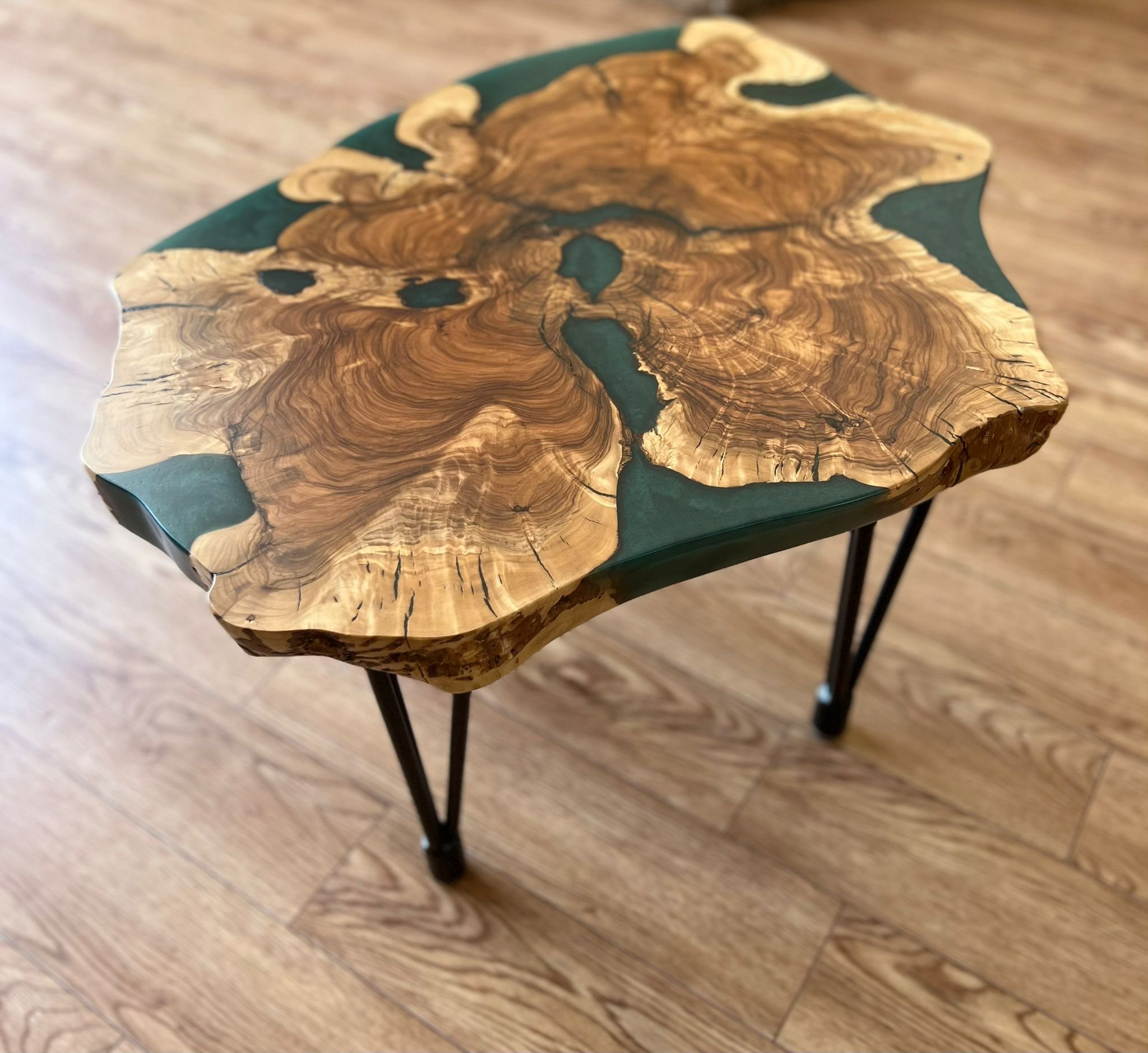 שולחן סלון עץ זית עם שילוב אפוקסי בצבע ירוק טורקיז 70*55 ס"מ /גובה 40 ס"מ/עובי 5ס"מ